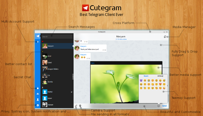 Cutegram 2.0.0 released, available for Ubuntu 15.04 vivid Vervet, ubuntu 14.10 Utopic Unicorn, Ubuntu 14.04 Trusty Tahr (LTS), Ubuntu 13.10/13.04/12.04, Linux Mint 17.1 Rebecca, Linux Mint 17 Qiana (PPA), OpenSUSE 13.1, OpenSUSE 13.2, Mageia 4, Mageia 5, Chakra Linux and Mac OSX